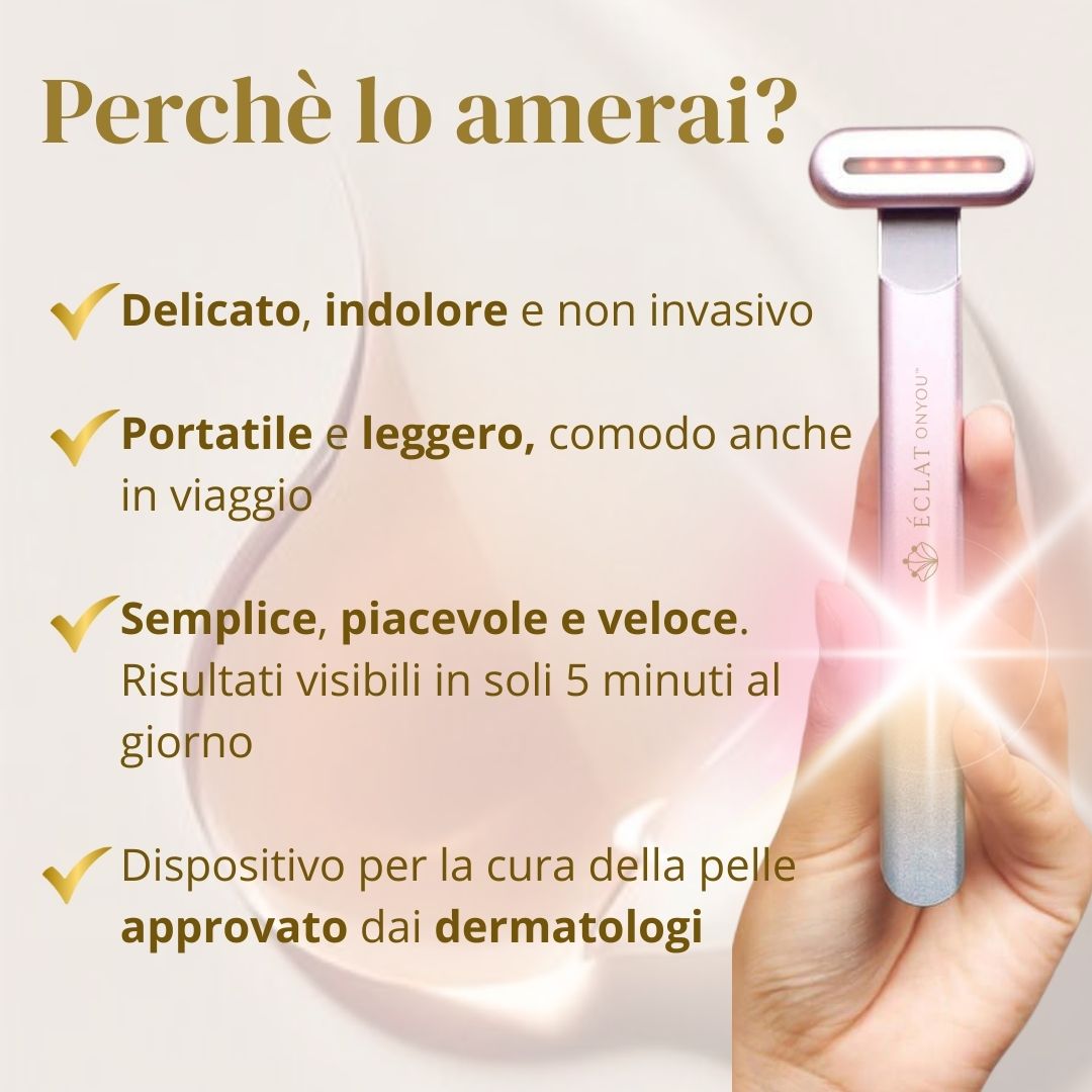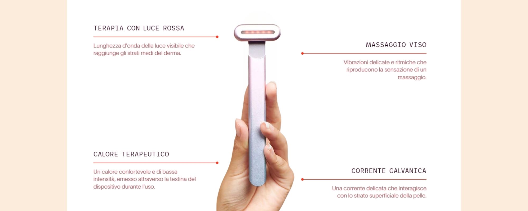 Il dispositivo LED utilizza tecnologie sicure, non invasive, approvate da dermatologi internazionali e studiate per ogni tipo di pelle, anche le più sensibili.
