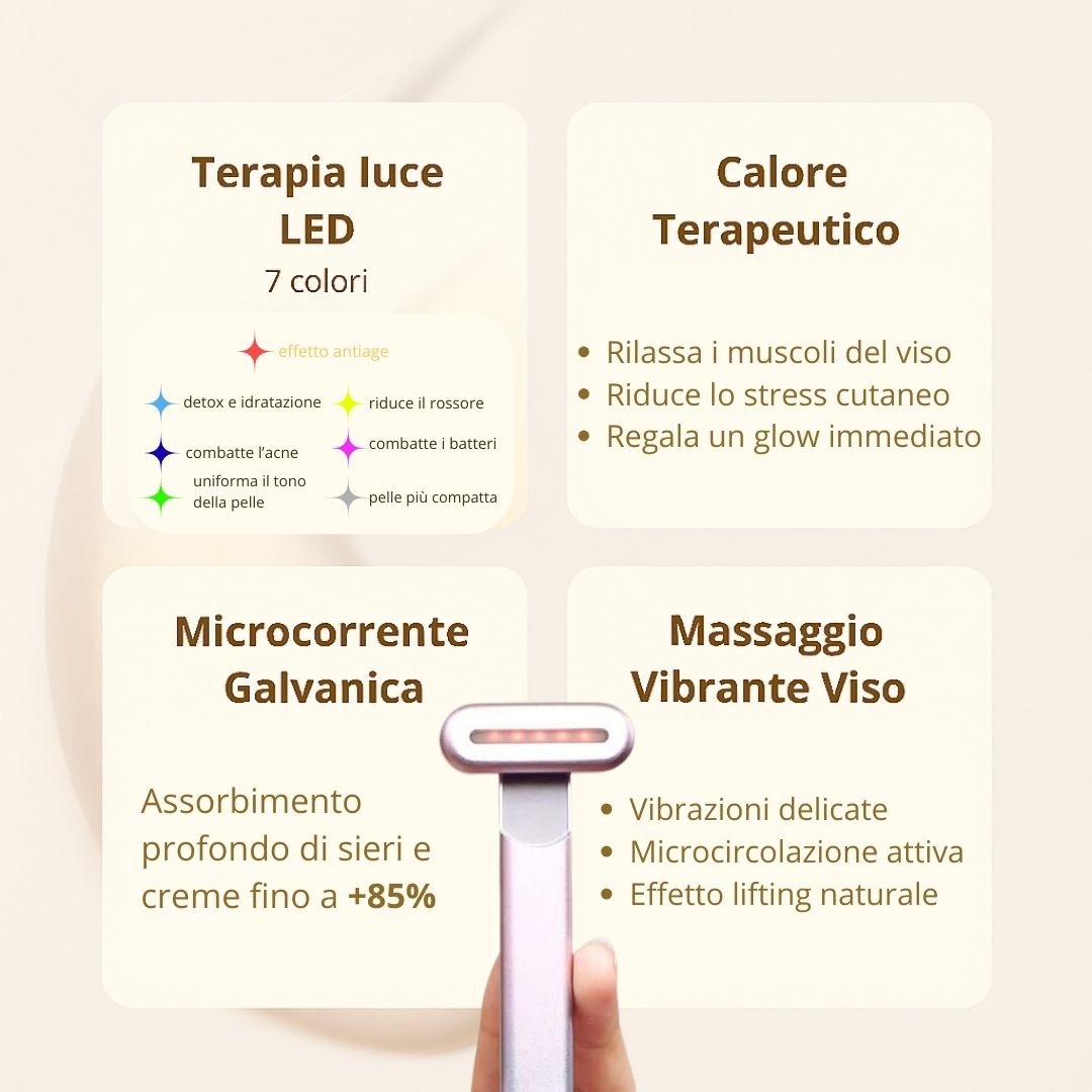 LED 7 colori, microcorrente galvanica, massaggio vibrante e calore terapeutico.